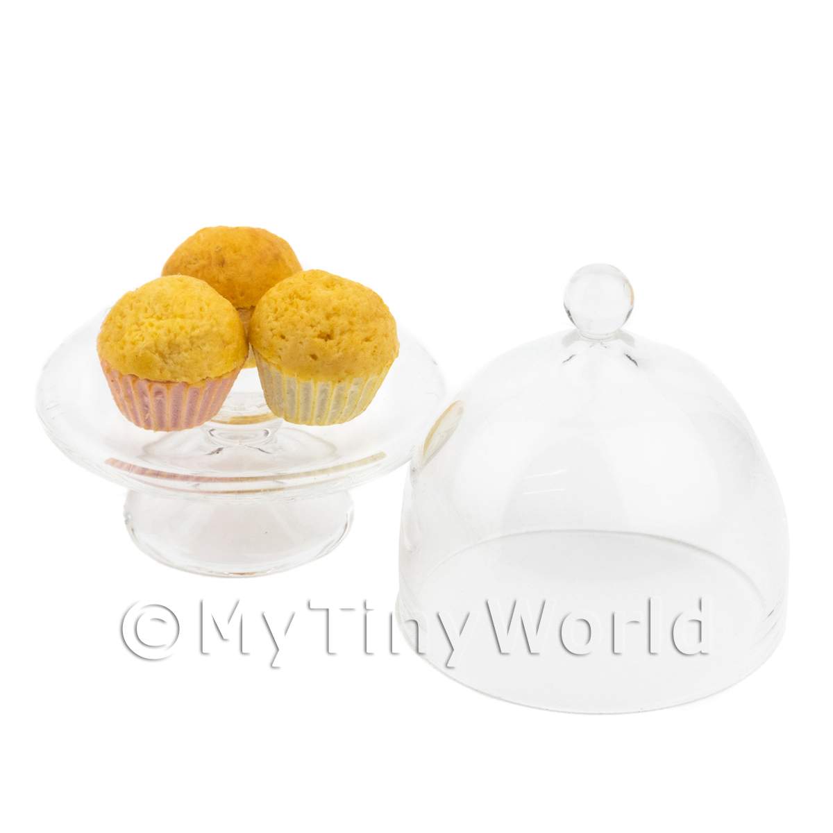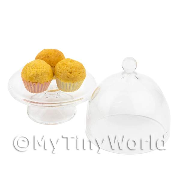 dolls house miniature three plain cupcakes on a glass cake stand with lid