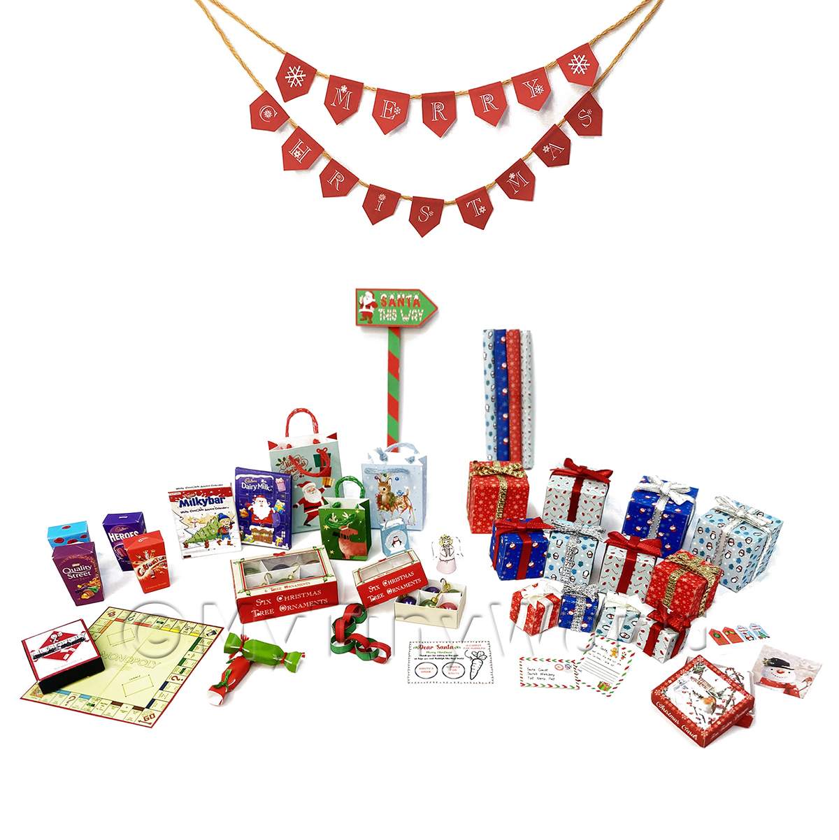 Once made up this kit includes, Gift Bags x 4, Presents x 12, Santa Sign x 1, Paper Chains, Christmas Cards x 4, Advent Calendars x2, Santa Letter, Baubles in a box x 2, Angel Tree Topper, Gift tags x 16, Chocolate Box x 4, Board Game x 1, Crackers x 12, Bunting, Cane Slices,