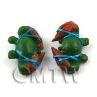 Two green crabs with claws tied. Our range of air dried clay shellfish are individually hand made with air dried clay unless stated and hand painted to the highest quality producing a unique item each time.