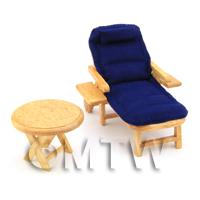 A Wooden Sun Lounger With Blue Covered Cushions and A Wood Table