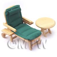 A Wooden Sun Lounger With Green Covered Cushions and A Wood Table
