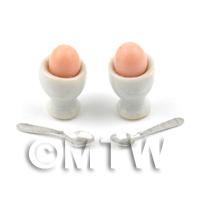 2 Dolls House Miniature Eggs in White Ceramic Egg Cups With Spoons