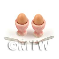 2 Dolls House Miniature Eggs in Pink Ceramic Egg Cups With Spoons