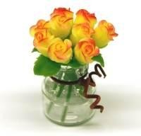 9 Hand made flexible Yellow & Red Roses In A Glass Vase.